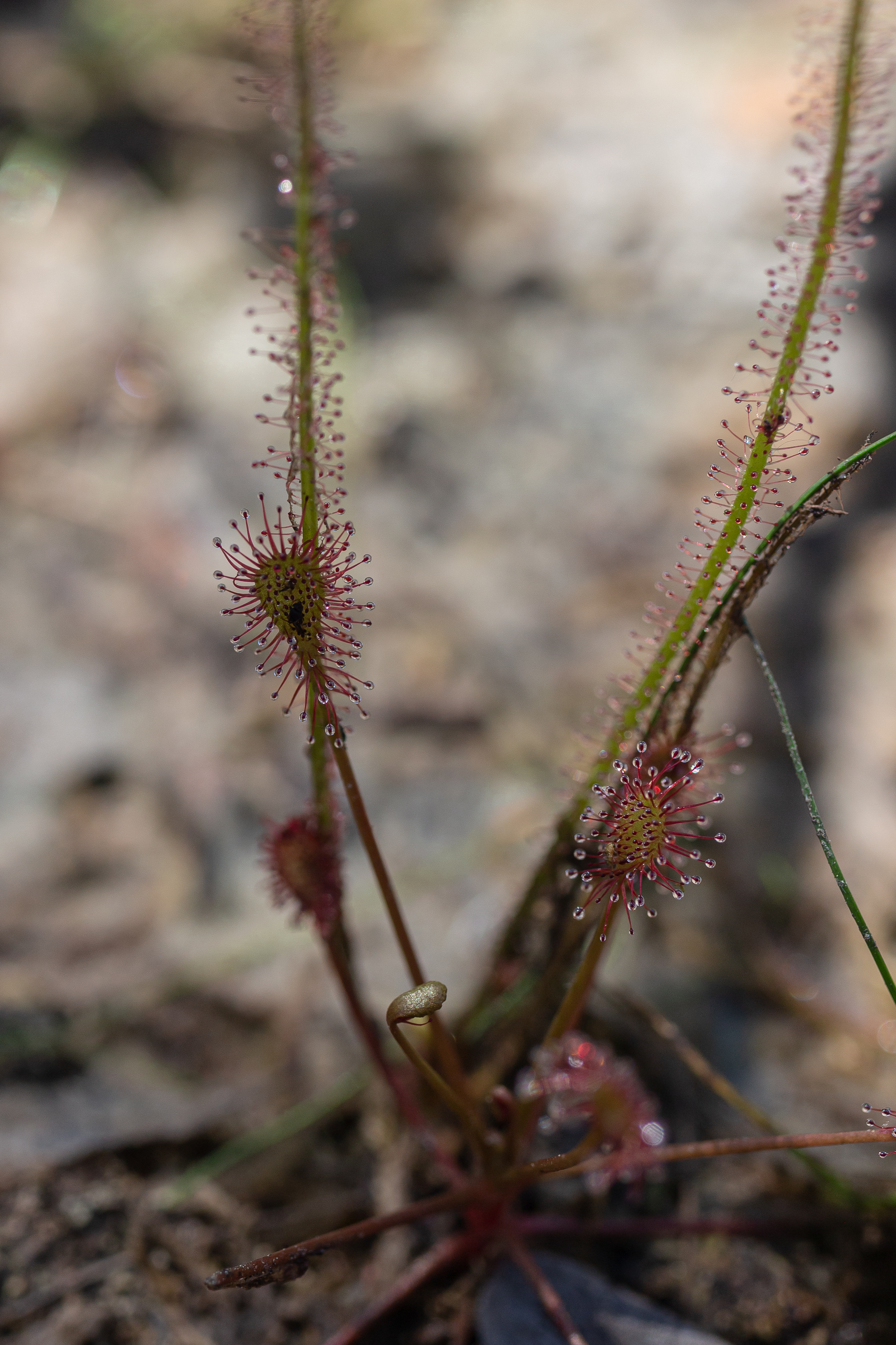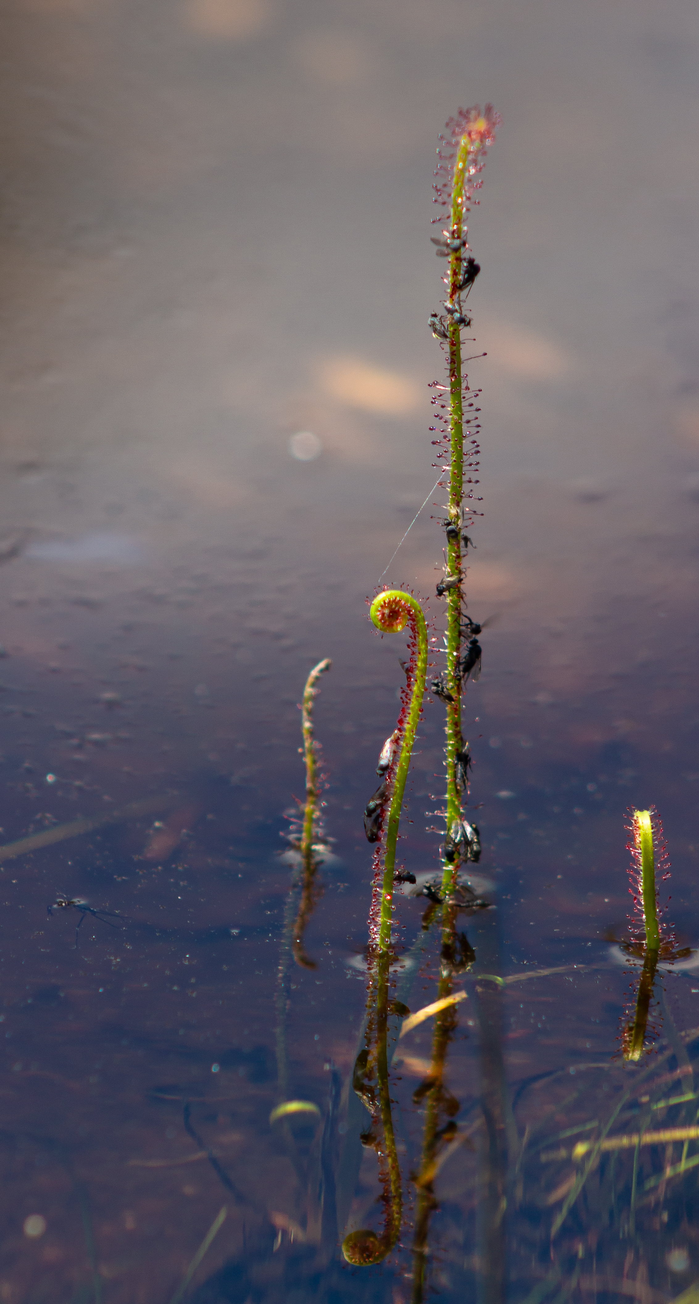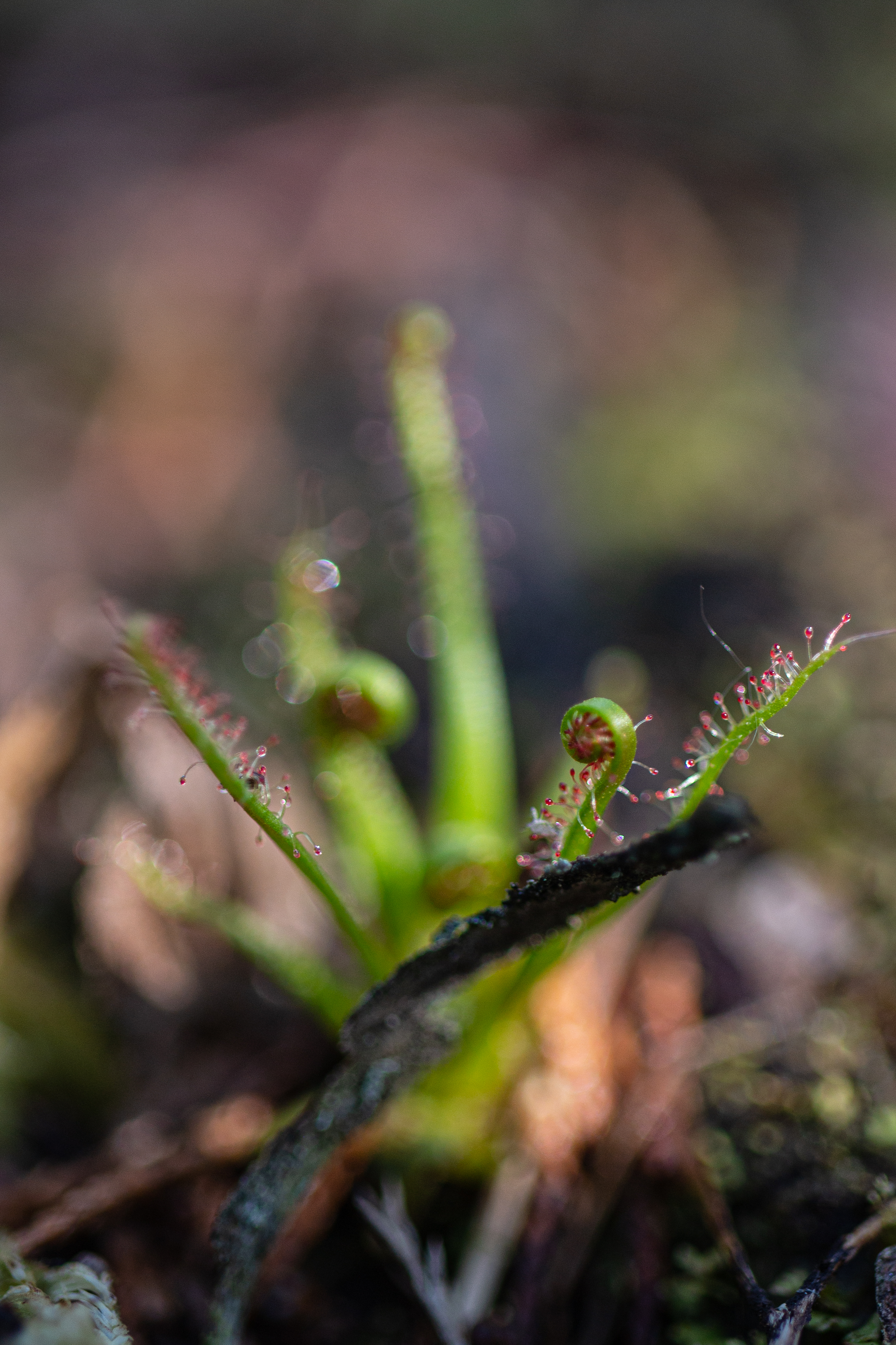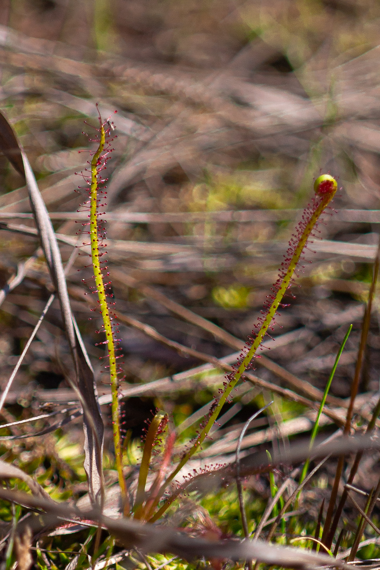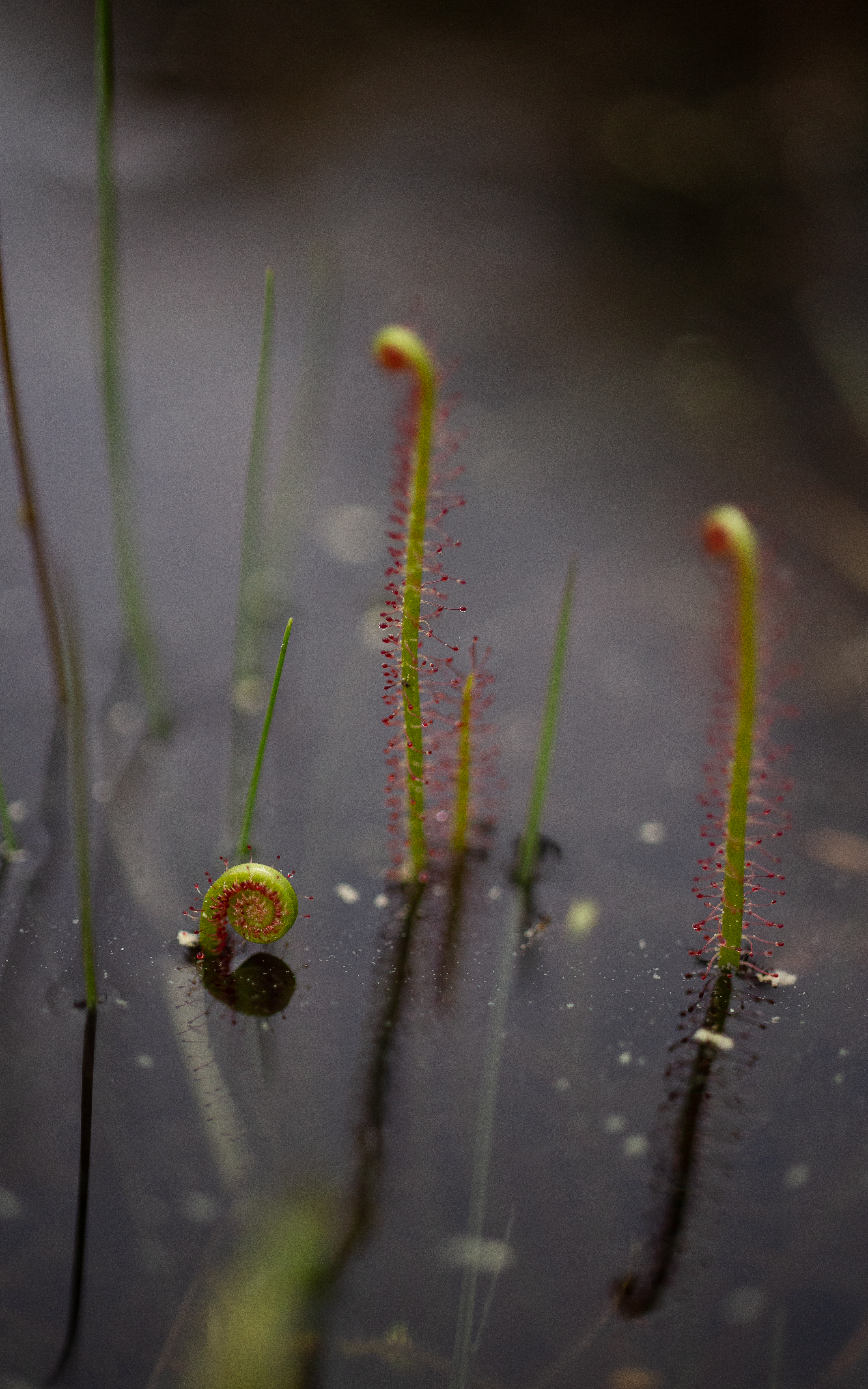 The leaves grow straight up during early spring; the first two images show a Drosera waking up from its dormancy. The leaves standing up help the sundew catch prey even when it floods. These sundews grow in swamps and bogs, which remain wet throughout the year. In the third image you can see the erect leaf