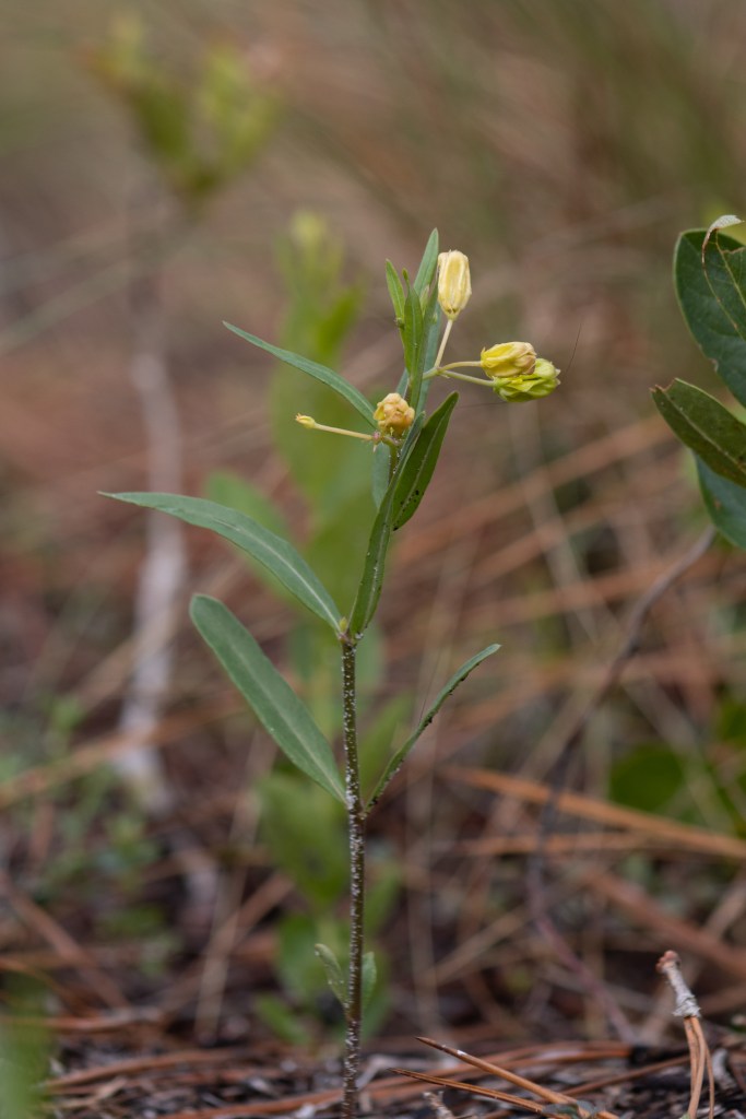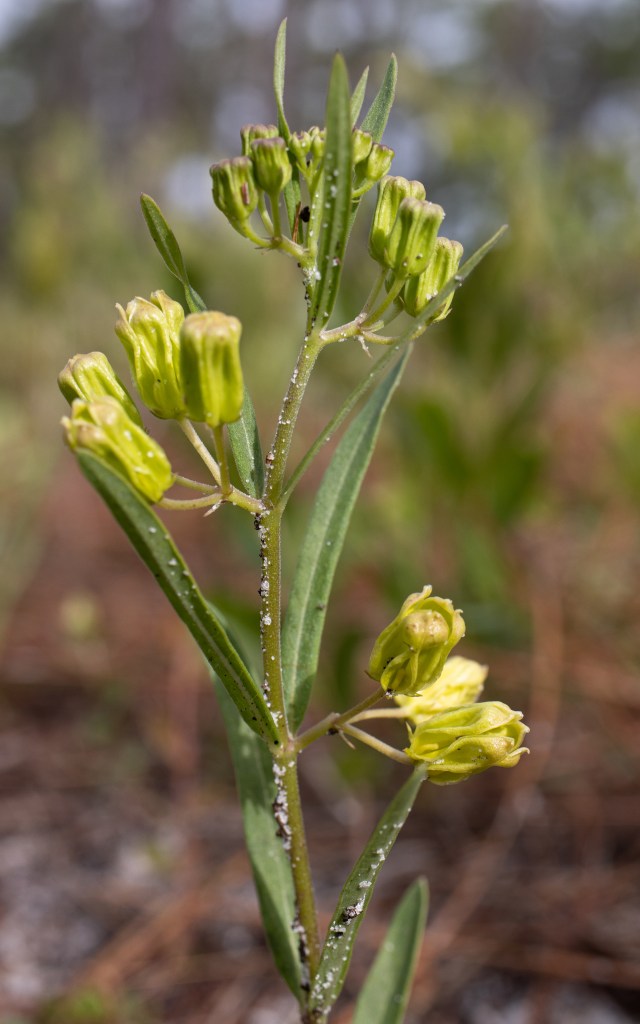 The plant grows in open grassland or pinelands, with a fire-based ecology. It grows about a foot from the ground with a bunch of flower buds in the summer. Its flowers are not as showy as those characteristics of other milkweeds.