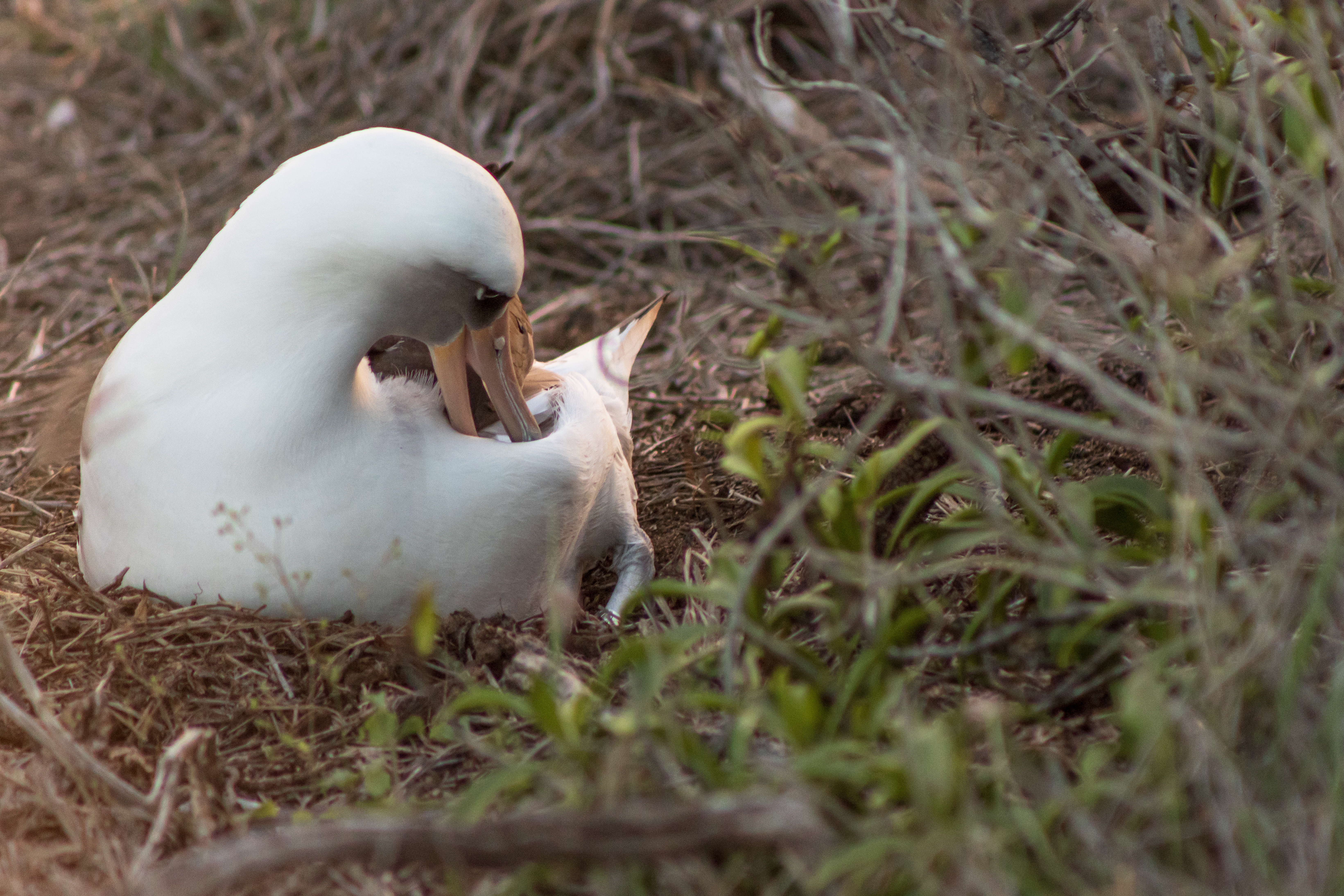 Albatross tend to bond for life. To the right is a pair of albatross settling in for the night in a grove of possible false sandalwood.
