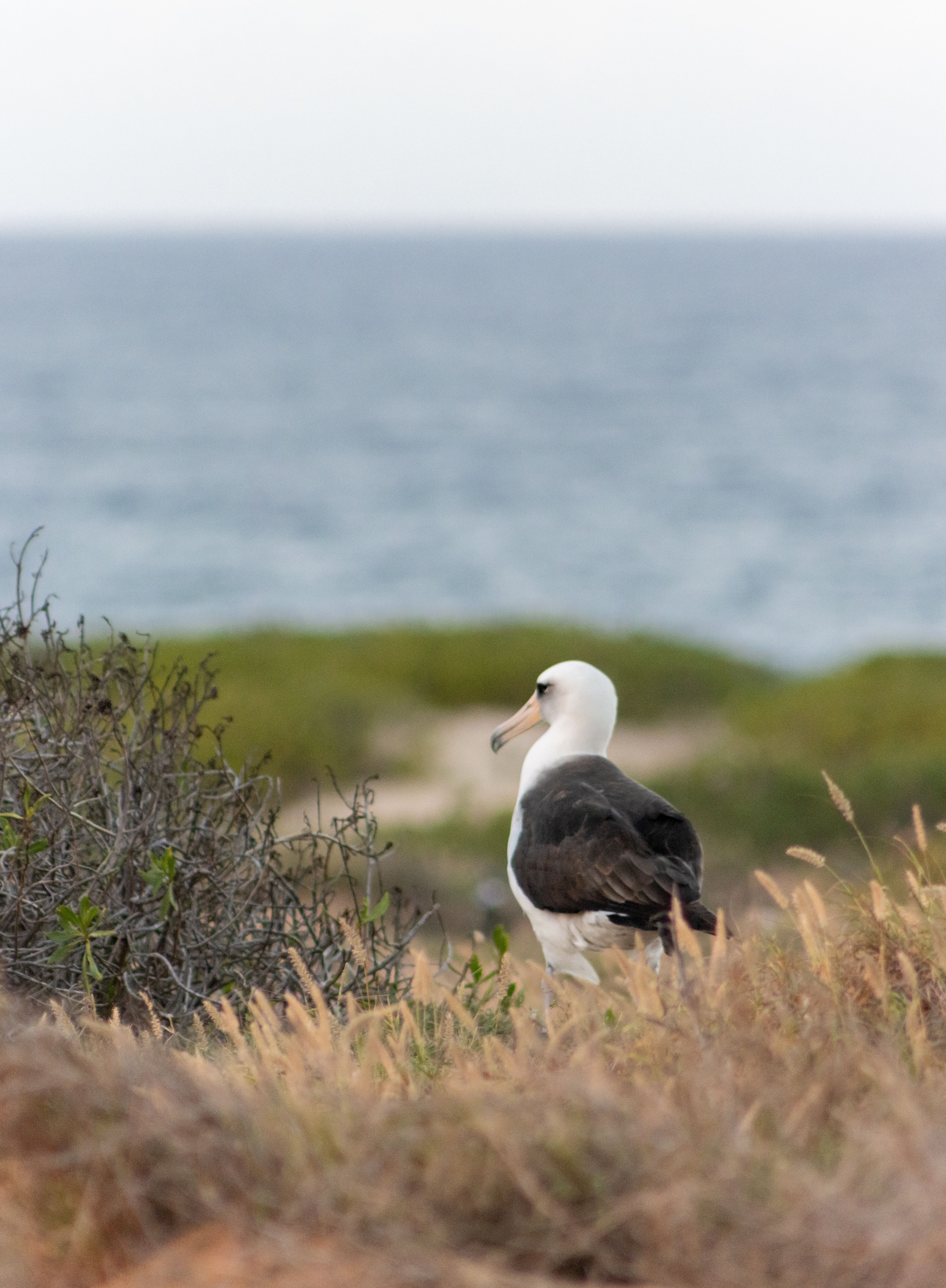 The Laysan albatross is a large seabird that ranges across the North Pacific. More than 99% of the breeding population of the bird lives in the northern Hawaiian island, specifically in the midway atoll and Laysan islands. The species suffered a drastic population reduction in the early 1900s due to immense scale slaughter of populations for their feathers. The species is not recovering and is now classified as near threatened.