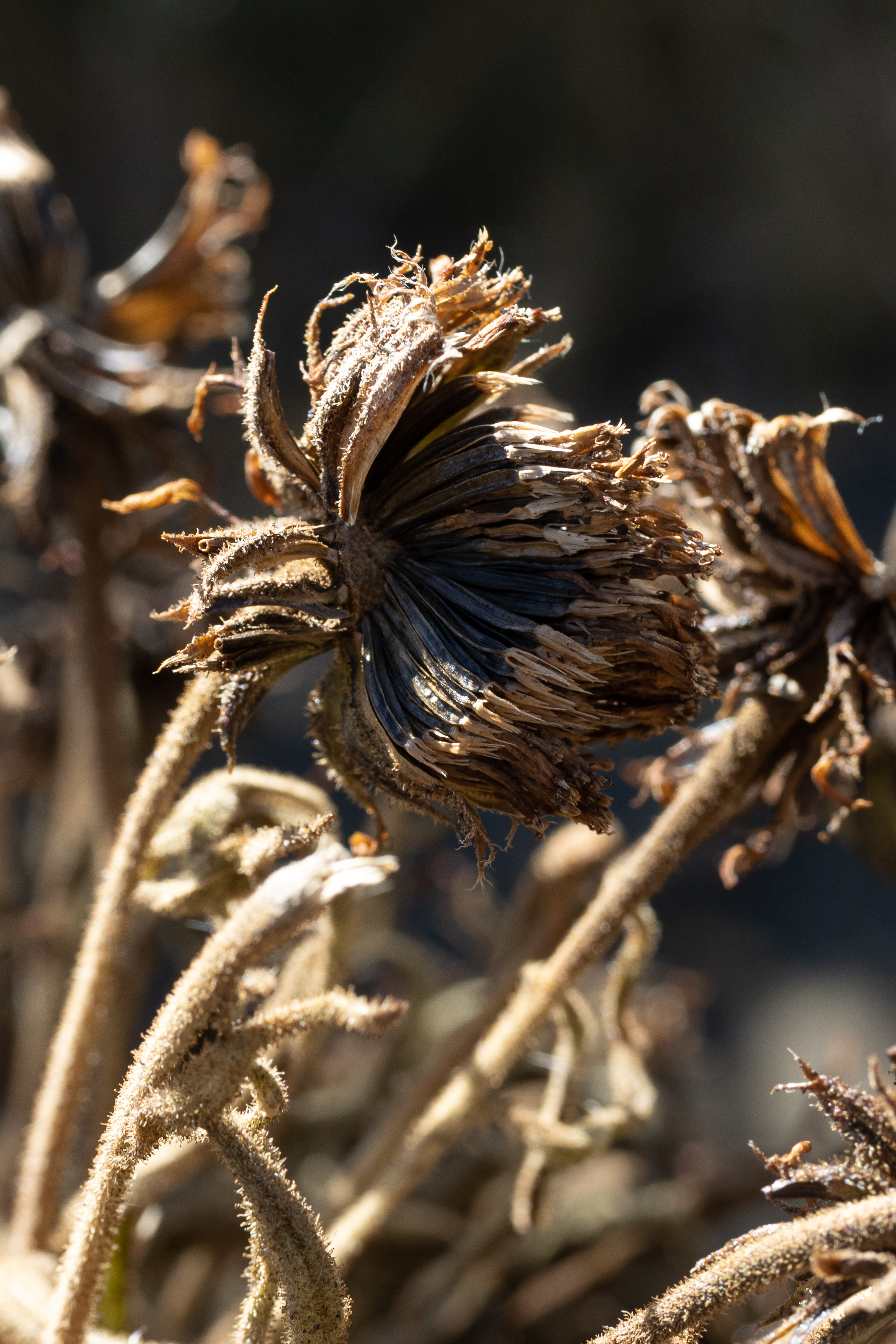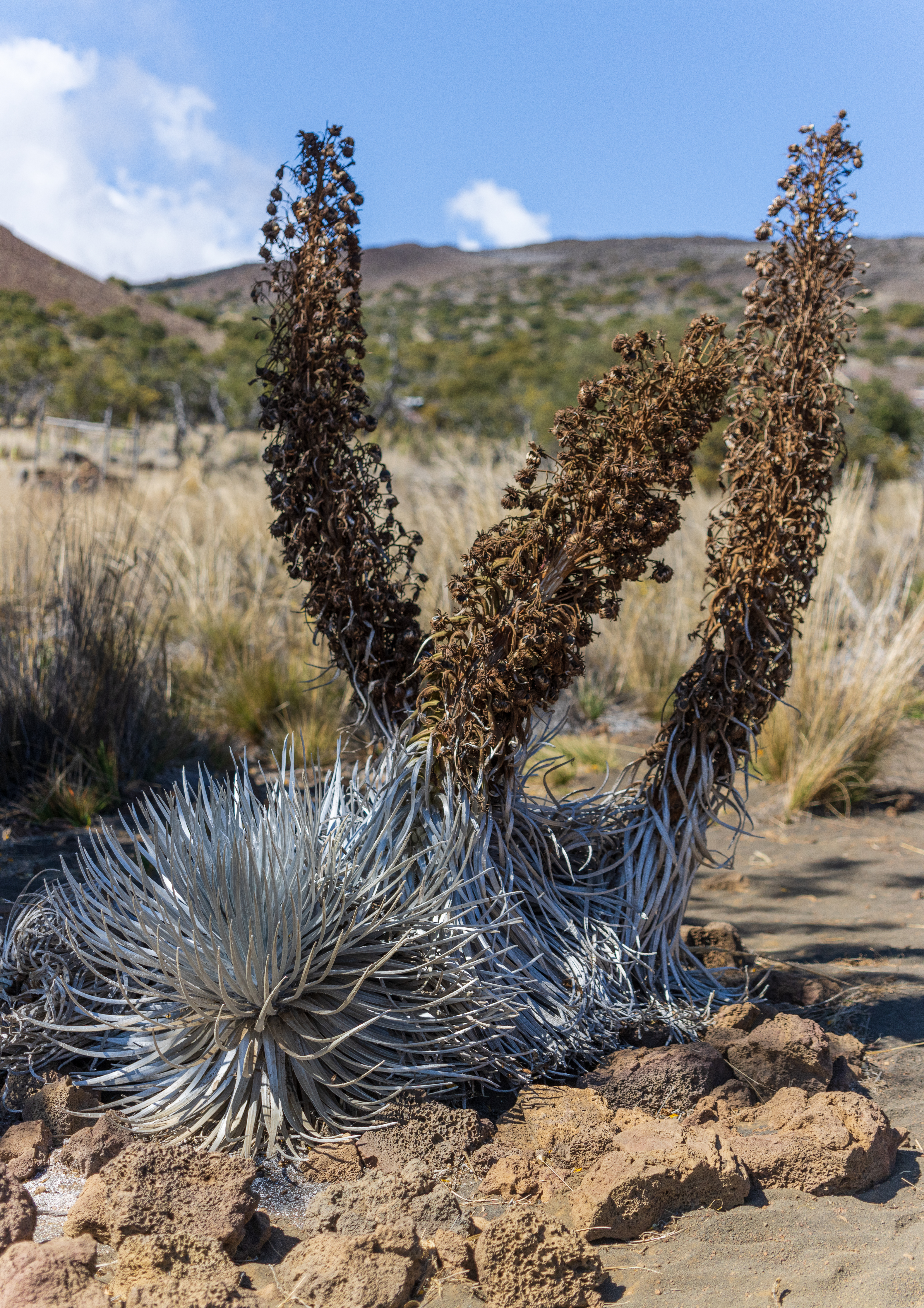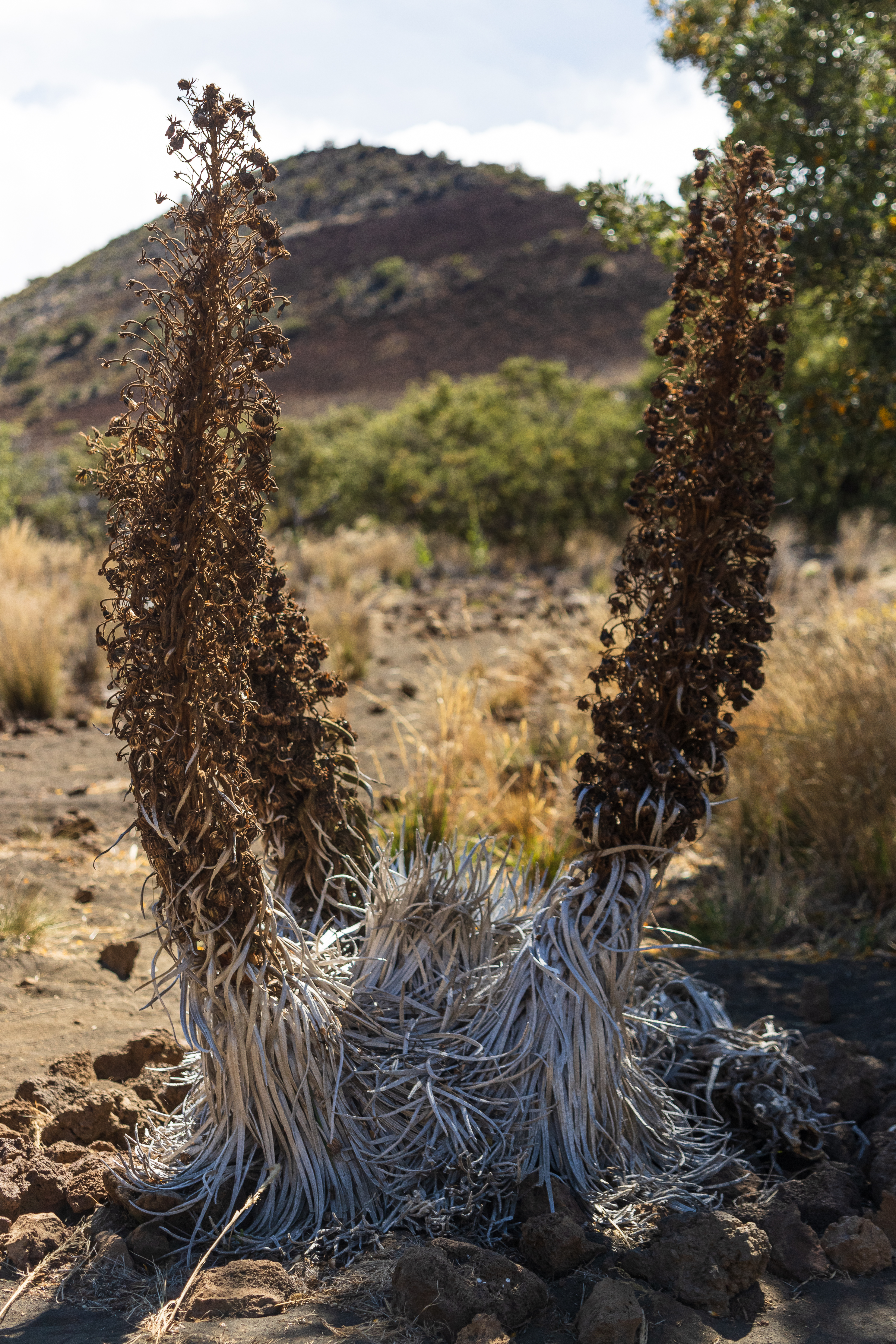 I was lucky enough to find these plants in a protected trail in Mauna Kea, kept under watch but left to the elements. Seeing them was a delight. At 9000 ft, the climate is not what you would expect from a place advertised relentlessly as a tropical paradise. The weather is much colder and harsher at that altitude, allowing the unique plants to survive. I visited them after they had done flowering for the year. Still, their giant flower stalks were left looking impressive, with a fresh batch of seeds! Hopefully, I can revisit them in the coming years and witness their magnificent blooms.