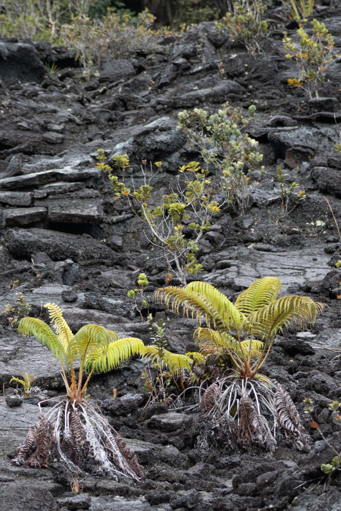 Five Amaumau fern grow on lava flows created in the early 20th century with other pioneer species like ‘Ohi’a lehua.